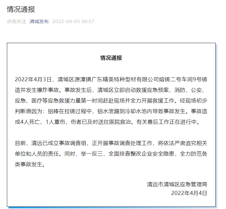 4月3日,清城區(qū)源潭鎮(zhèn)廣東精美特種型材有限公司熔鑄二號車間9號鑄造井發(fā)生爆炸事故。事故發(fā)生后,清城區(qū)立即啟動(dòng)救援應(yīng)急預(yù)案,消防、公安、應(yīng)急、醫(yī)療等應(yīng)急救援力量第一時(shí)間趕赴現(xiàn)場并全力開展救援工作。經(jīng)現(xiàn)場初步判斷原因?yàn)椋轰X棒在拉鑄過程中,鋁水泄漏到冷卻水池內(nèi)導(dǎo)致事故發(fā)生。事故造成4人死亡、1人重傷,傷者已及時(shí)送往醫(yī)院救治。有關(guān)善后工作正在進(jìn)行中。