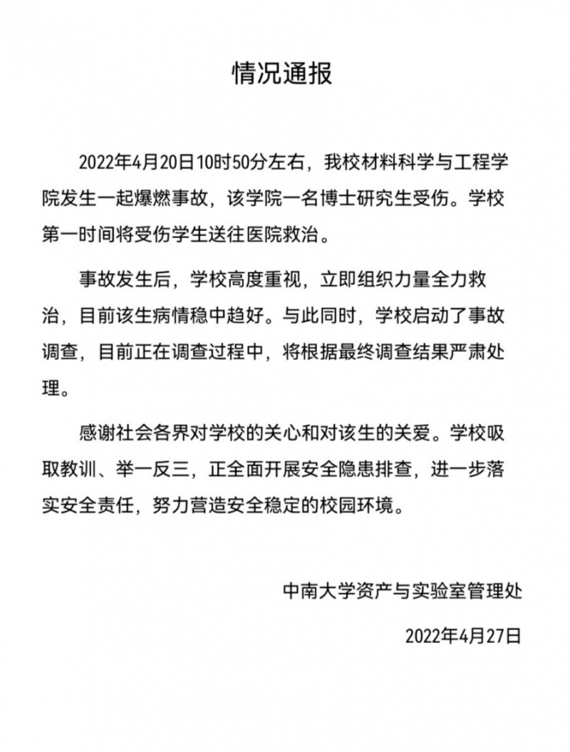 通報中稱,中南大學(xué)材料科學(xué)與工程學(xué)院于4月20日發(fā)生一起爆燃事故,導(dǎo)致一名博士研究生受傷。學(xué)校已于第一時間將受傷學(xué)生送往醫(yī)院救治,目前該生病情穩(wěn)中趨好。學(xué)校已啟動事故調(diào)查,將根據(jù)最終調(diào)查結(jié)果嚴(yán)肅處理。