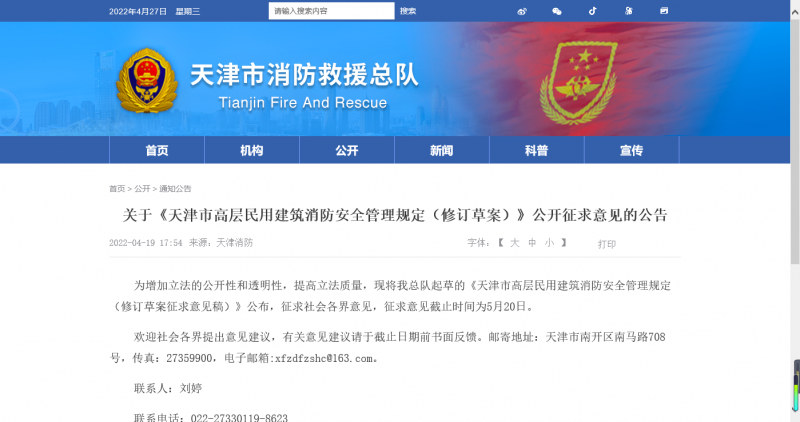 為增加立法的公開性和透明性,提高立法質(zhì)量,天津市消防救援總隊起草《天津市高層民用建筑消防安全管理規(guī)定(修訂草案征求意見稿)》,對外征求社會各界意見,征求意見截止時間為5月20日。