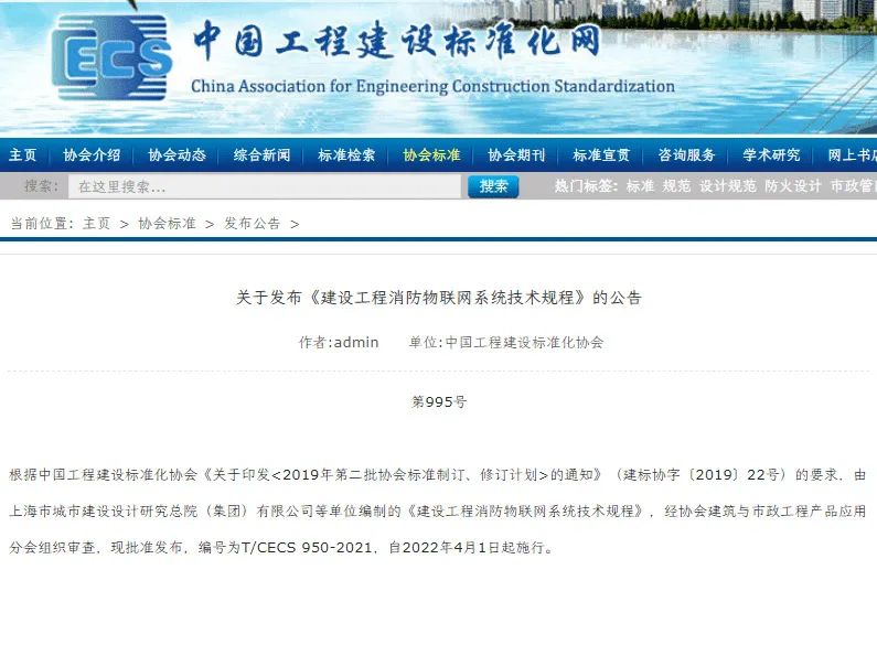由上海市城市建設(shè)設(shè)計研究總院(集團)有限公司主編,尼特智能科技股份有限公司參編的中國工程建設(shè)標準化協(xié)會標準《建設(shè)工程消防物聯(lián)網(wǎng)技術(shù)規(guī)程》T/CECS 950-2021已正式實施。