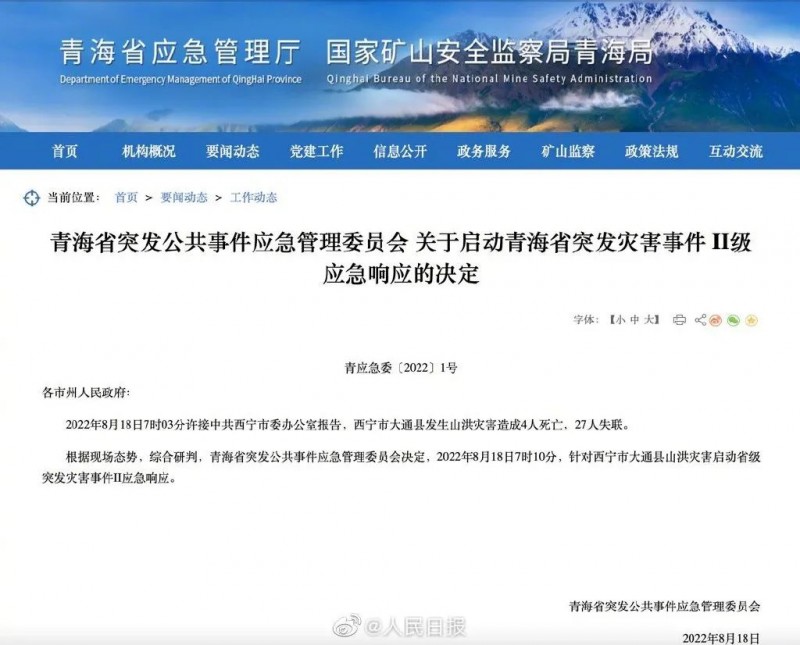 青海省應(yīng)急管理廳網(wǎng)站8月18日消息,2022年8月18日12時許接中共西寧市委辦公室報告,西寧市大通縣發(fā)生山洪災(zāi)害造成16人死亡,36人失聯(lián)。根據(jù)現(xiàn)場態(tài)勢,綜合研判,青海省突發(fā)公共事件應(yīng)急管理委員會決定,2022年8月18日7時10分,針對西寧市大通縣山洪災(zāi)害啟動省級突發(fā)災(zāi)害事件Ⅱ應(yīng)急響應(yīng)。