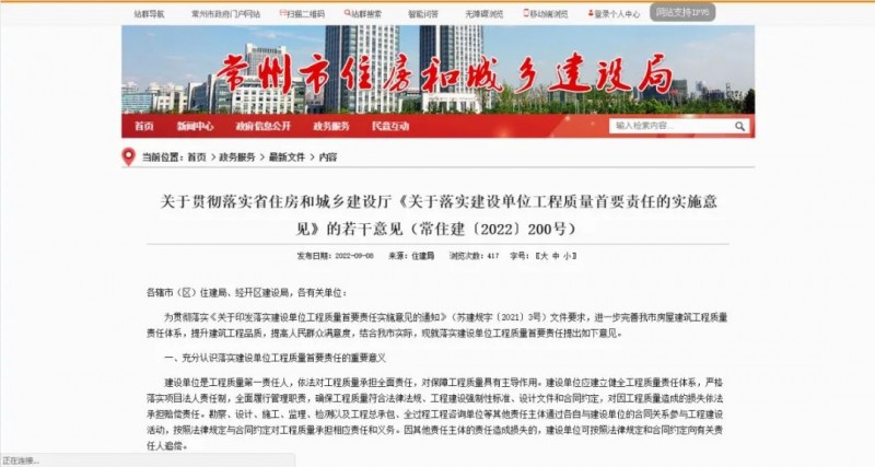 近日,江蘇省常州市住建局發(fā)布關(guān)于貫徹落實省住房和城鄉(xiāng)建設(shè)廳《關(guān)于落實建設(shè)單位工程質(zhì)量首要責(zé)任的實施意見》的若干意見,明確建設(shè)單位是工程質(zhì)量第一責(zé)任人。