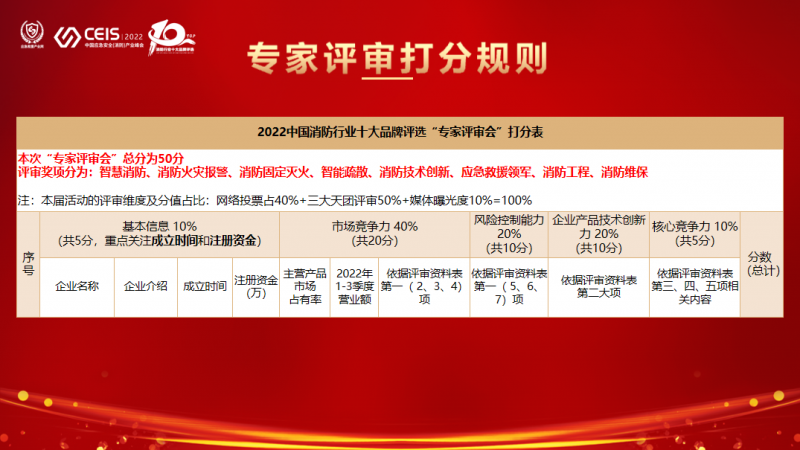 評(píng)審正式開始,孔凱麗對(duì)本屆“CEIS2022暨中國消防行業(yè)十大品牌評(píng)選活動(dòng)的評(píng)選流程、獎(jiǎng)項(xiàng)設(shè)置以及評(píng)審方式、打分規(guī)則進(jìn)行了說明。