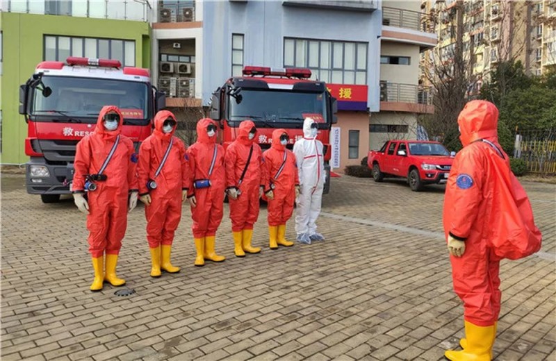 湖北省武漢市火神山消防救援站的黨員突擊隊(duì)在開(kāi)展防疫洗消訓(xùn)練前集合(2月5日攝)新華社