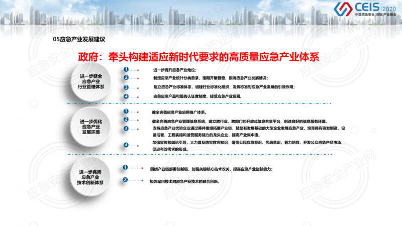 政府引導(dǎo)政策扶持,加快應(yīng)急產(chǎn)業(yè)發(fā)展。他指出當(dāng)前應(yīng)急產(chǎn)業(yè)發(fā)展缺乏明確的政策引導(dǎo)方向。有了產(chǎn)業(yè)政策引導(dǎo),財(cái)政政策支持,應(yīng)急安全產(chǎn)業(yè)才會獲得長足發(fā)展。