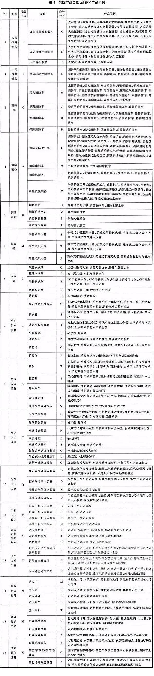 ③ 表1中未包含的消防新產(chǎn)品,其類別和品種代號(hào)可由產(chǎn)品歸口管理部門具體規(guī)定。