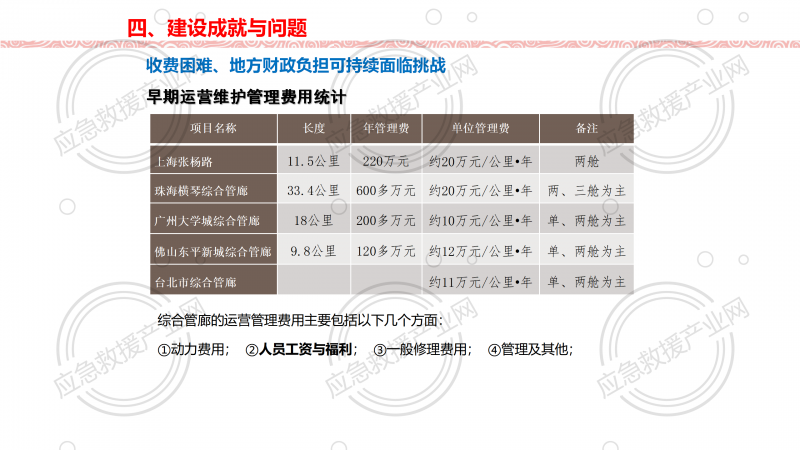 綜合管廊建設(shè)發(fā)展勢(shì)頭良好,政策指引下快速發(fā)展。他提到針對(duì)地上設(shè)施齊全、地下管線混亂、地面被反復(fù)“開(kāi)膛破肚”的現(xiàn)象,國(guó)家加強(qiáng)城市綜合管廊行業(yè)的頂層設(shè)計(jì),各級(jí)政府配合出臺(tái)相關(guān)管理規(guī)定,科學(xué)合理規(guī)劃城市綜合管廊的發(fā)展,目前綜合管廊已建成較為完善的工程建設(shè)規(guī)范和標(biāo)準(zhǔn)體系,形成了一批新興行業(yè)管理與行業(yè)協(xié)會(huì)。工程建設(shè)和管理創(chuàng)新實(shí)踐領(lǐng)域取得諸多成果。