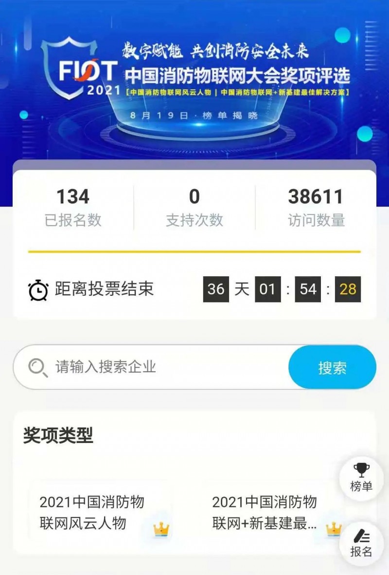 由中國(guó)安全產(chǎn)業(yè)協(xié)會(huì)消防技術(shù)創(chuàng)新專委會(huì)、應(yīng)急救援產(chǎn)業(yè)網(wǎng)主辦、相關(guān)行業(yè)協(xié)會(huì)指導(dǎo)支持的“數(shù)字賦能 共創(chuàng)消防安全未來”FIOT2021中國(guó)消防物聯(lián)網(wǎng)大會(huì)特設(shè)獎(jiǎng)項(xiàng)評(píng)選活動(dòng)是消防行業(yè)盛事。自評(píng)選活動(dòng)報(bào)名啟動(dòng)以來,十二天里,線上報(bào)名反響強(qiáng)烈,報(bào)名超過130個(gè)(人/方案),活動(dòng)訪問數(shù)量已突破38000+。