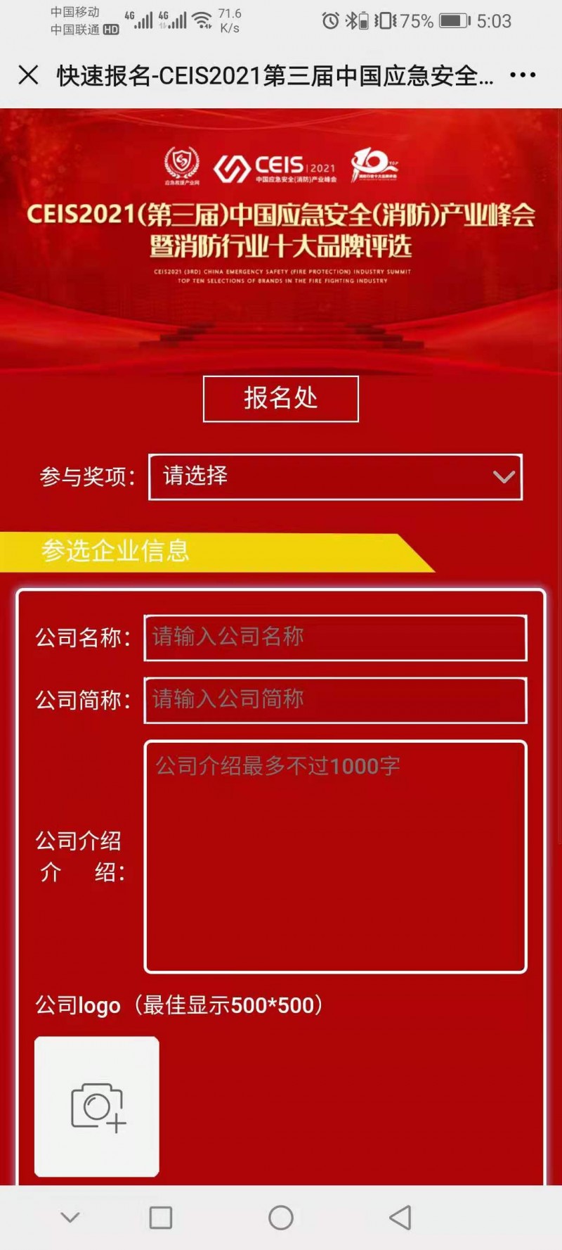 第二步:點(diǎn)擊“企業(yè)報(bào)名”進(jìn)入報(bào)名界面,填寫(xiě)詳細(xì)資料。報(bào)名資料提交成功后,會(huì)收到提示“報(bào)名成功,信息已提交,等待審核”。