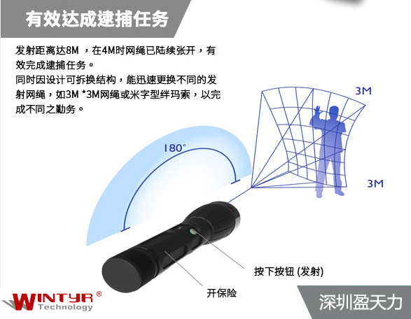 ⑤、發(fā)射距離達8-10M,在4M時網繩已陸續(xù)張開,有效完成逮捕任務。