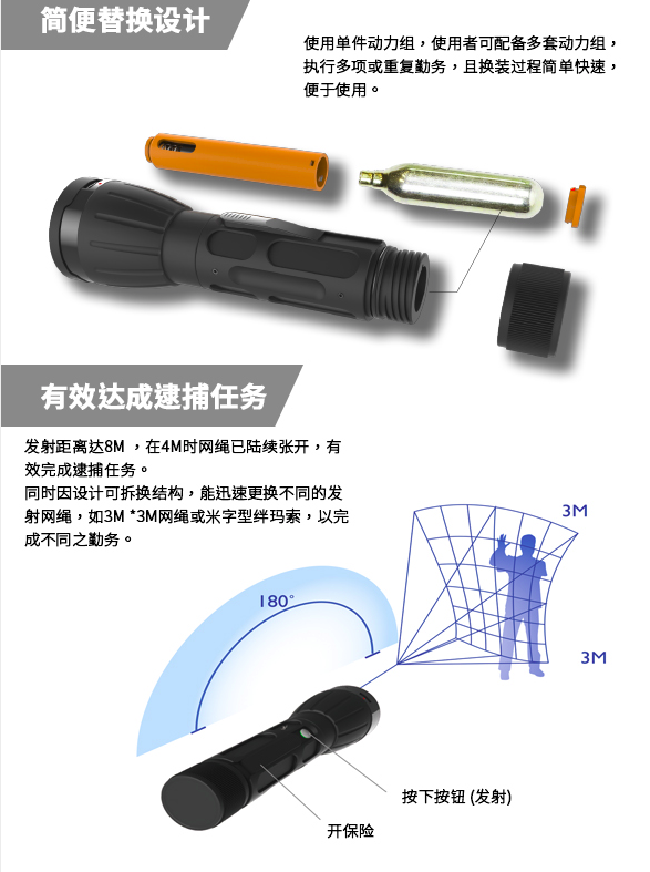 6、 發(fā)射最佳有效距離 8-10M,在4M時網(wǎng)繩陸續(xù)張開。