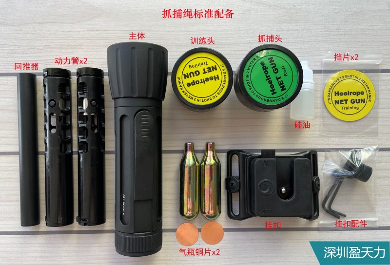 一、 標(biāo)準(zhǔn)配備:抓捕繩主體×1、訓(xùn)練頭×1、抓捕頭×1、黑色動力管×2,8g小氣瓶×2,爆破筒片×2,掛扣套裝×1,回推器×1,2mm內(nèi)六角扳手×1,2.5mm內(nèi)六角扳手×1